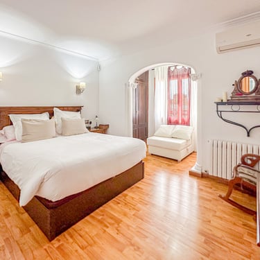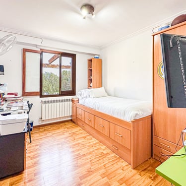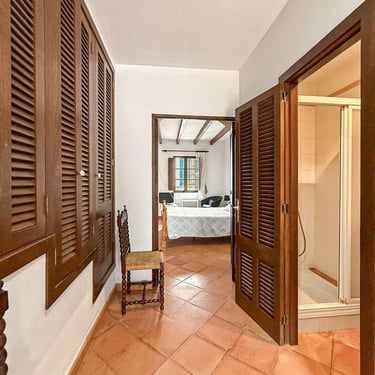 La planta superior, renovada hace pocos años, tiene entrada totalmente independiente de la primera casa y se accede a través de una terraza de 30 metros cuadrados. Esta planta ofrece un amplio salón-comedor con un balcón de 40 metros cuadrados. Desde aquí, se accede a las tres habitaciones dobles, todas ellas con armarios empotrados. La habitación principal cuenta además con un pequeño vestidor. La planta también incluye dos baños completos, uno con bañera y otro con plato de ducha, así como una cocina independiente con comedor, equipada con una pequeña despensa y área de lavandería. Desde esta última, se accede a una terraza-balcón de 14 metros cuadrados con vistas al jardín trasero.