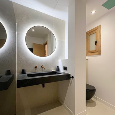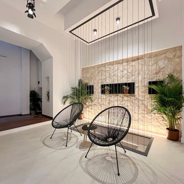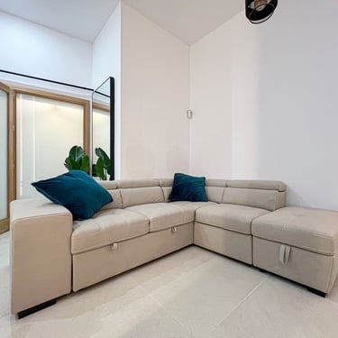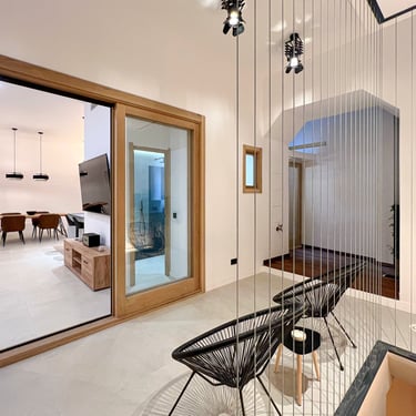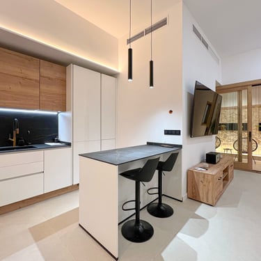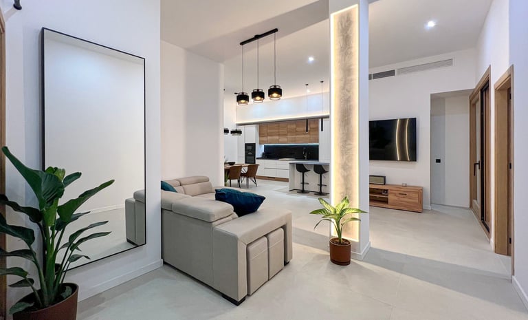 Al ingresar a la vivienda, te recibe un elegante hall de entrada con rejas y puerta de acceso de hierro, y portero automático, con posibilidad de usarlo como una terraza privada, que se conecta a un generoso salón-comedor-cocina de concepto abierto, lo que crea un ambiente amplio y luminoso. El salón está equipado con un sofá-cama esquinero, un gran televisor Samsung de 75 pulgadas y una pared decorada con iluminación indirecta, mientras que la cocina, de estilo moderno, está completamente equipada con muebles en color blanco y roble, electrodomésticos integrados Bosch (horno, microondas, placa de inducción con extracción integrada, lavavajillas y nevera), además de una encimera y frentes en porcelánico Techlam Top Noir Saint Laurent Mate, con grifería de diseño en color oro rosa cepillado. La zona de comedor está separada por una mesa de madera de roble para ocho personas, creando un espacio ideal para disfrutar de las comidas en familia o con amigos