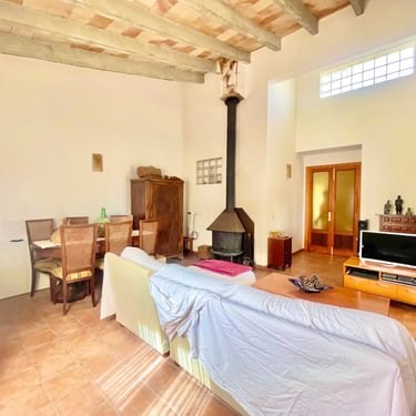 La propiedad se extiende en dos niveles: en la planta baja, encontrarás un espacioso vestíbulo, un amplio salón comedor con una acogedora estufa de leña, techos altos adornados con vigas de madera, una cocina independiente, 2 dormitorios dobles con armarios empotrados y un baño.
